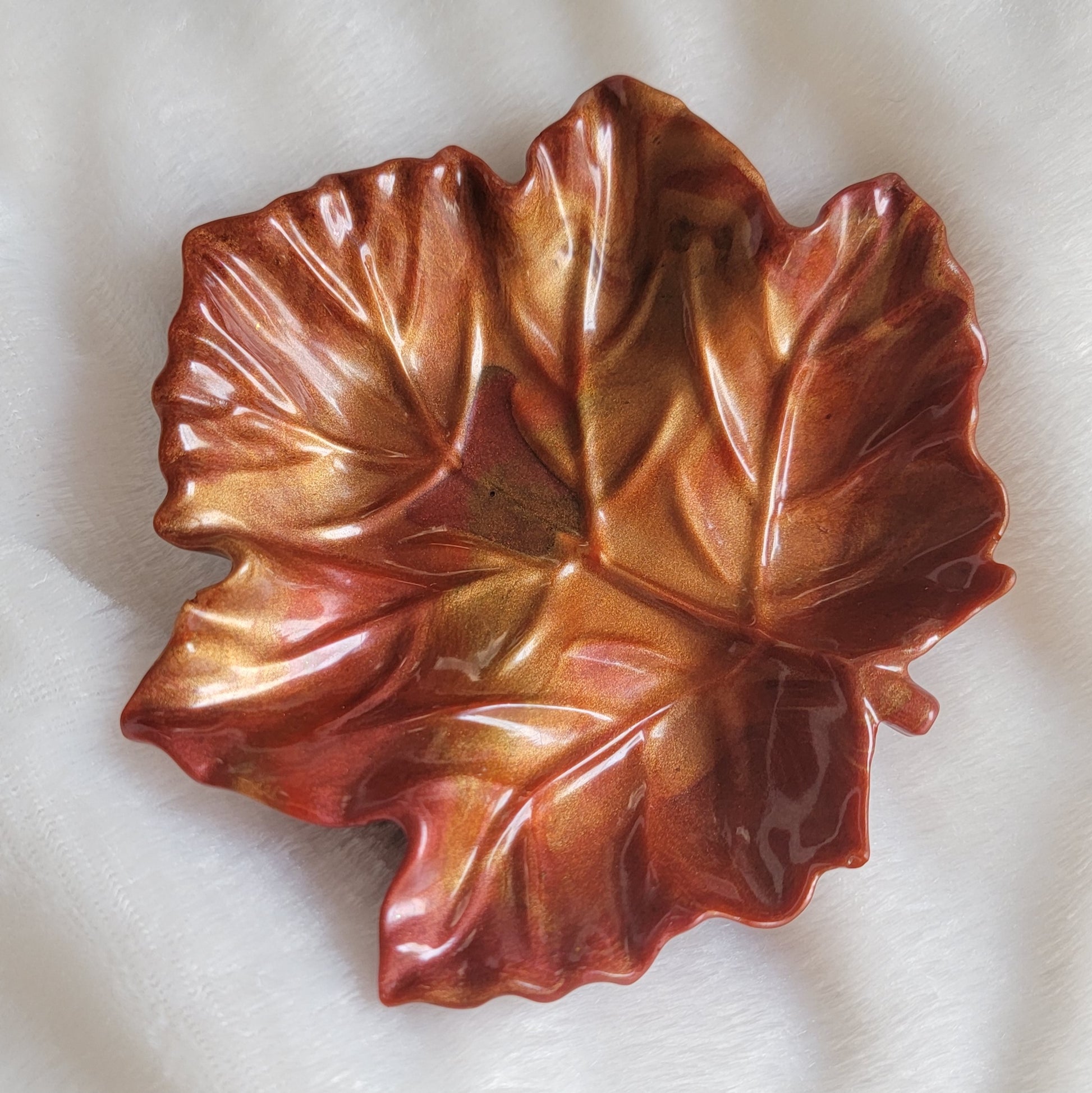 Add a touch of autumn charm to your home with a Maple Dish. Crafted from epoxy resin, this piece measures 5.36 x 6.25" and serves as a stunning decor piece or functional tray for loose change, keys, and jewelry. This exquisite maple leaf-shaped dish features a fluid swirl of warm red, golden and rusty hues.