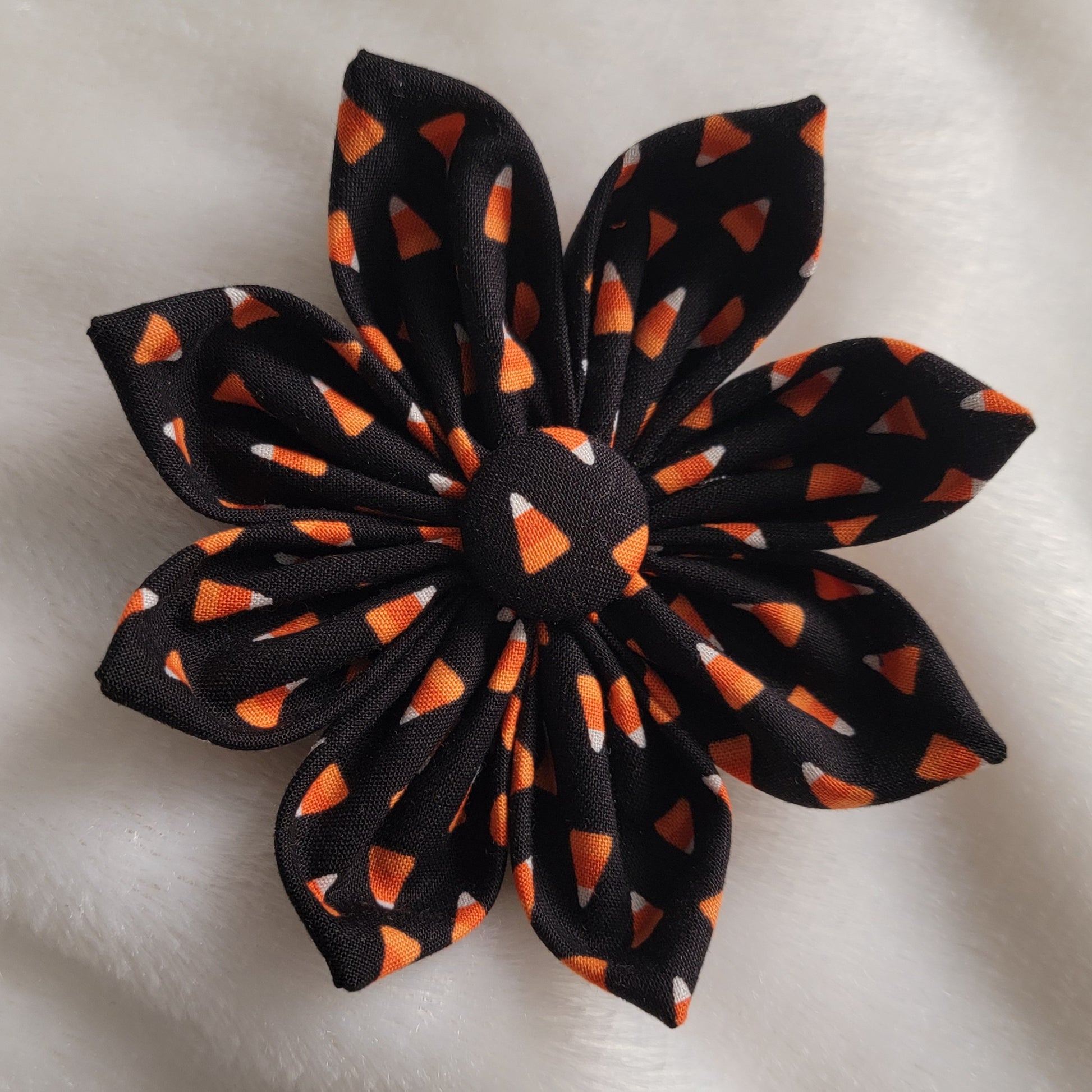 Add a pop of festive fun to your pet’s wardrobe with these handcrafted bowties, sailor bows, and flowers made from lightweight cotton. Featuring a bold candy corn print on a black background, each bow shines with a sparkling orange glitter center—because your furry friend deserves a little extra sparkle!
