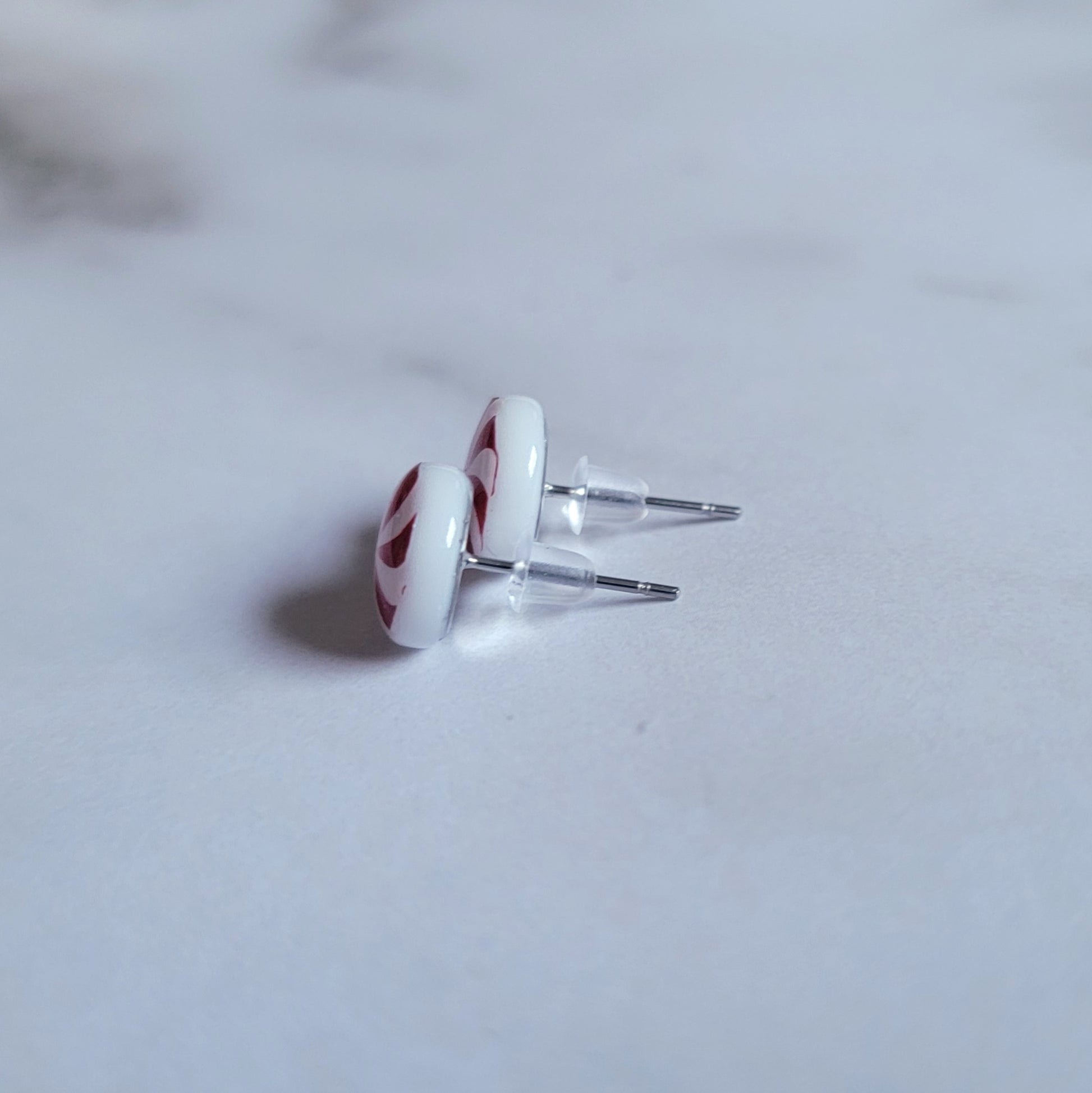 Elevate your holiday aesthetic with these exquisitely hand-crafted epoxy resin post earrings. Each 10mm round white base features vibrant metallic red candy swirls. Mounted on surgical steel posts with comfortable silicone backs, they offer the perfect balance of beauty and comfort.