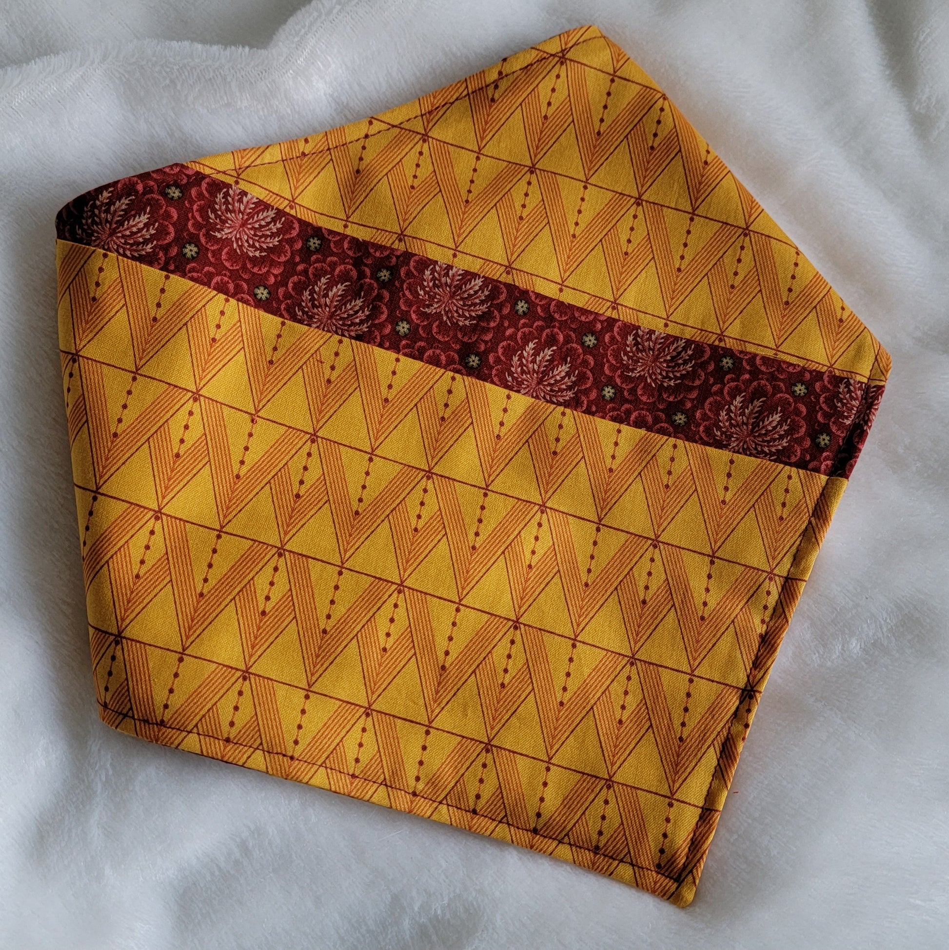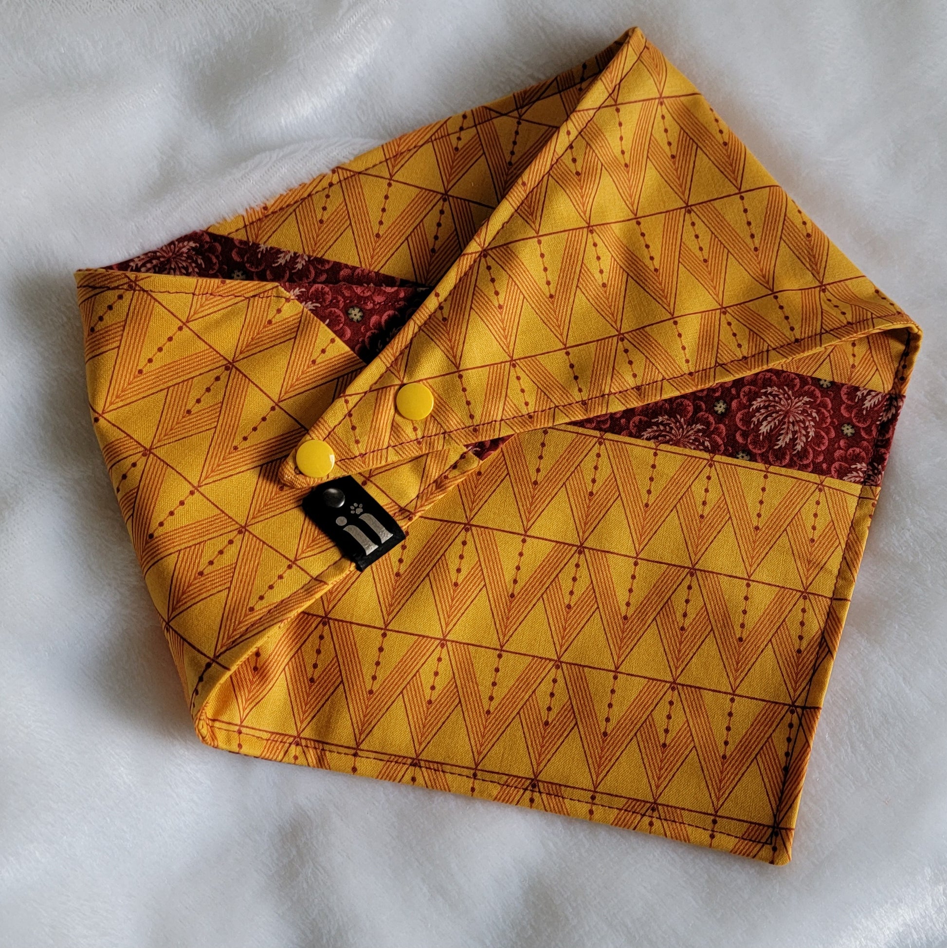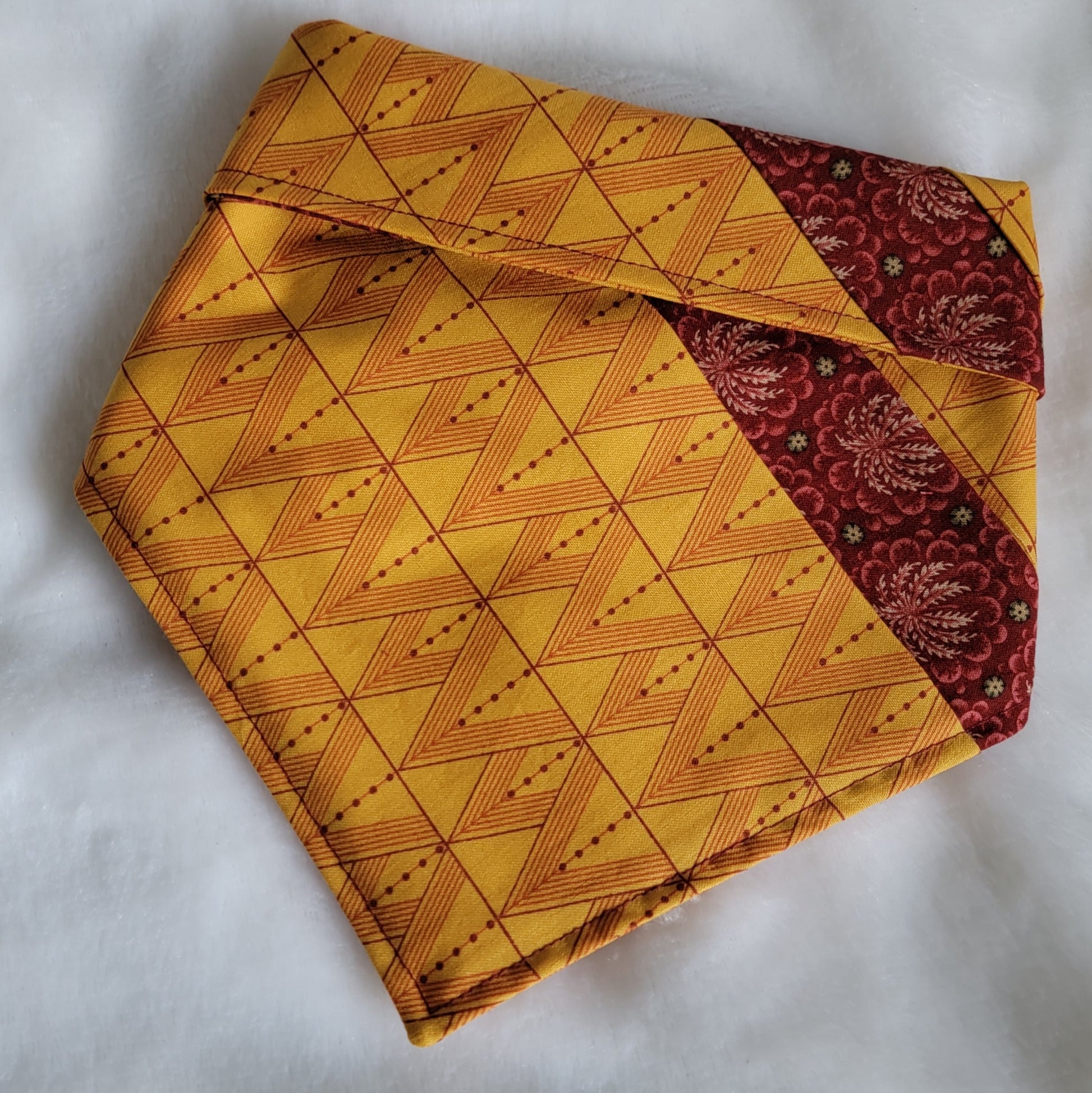 This one-of-a-kind handmade reversible pet bandana features a bold patchwork design, combining warm earthy yellow adorned with a burgundy geometric print and a delicate thin stripe of burgundy floral pattern. Designed for versatility and style, it combines visual appeal and comfortable wearability.