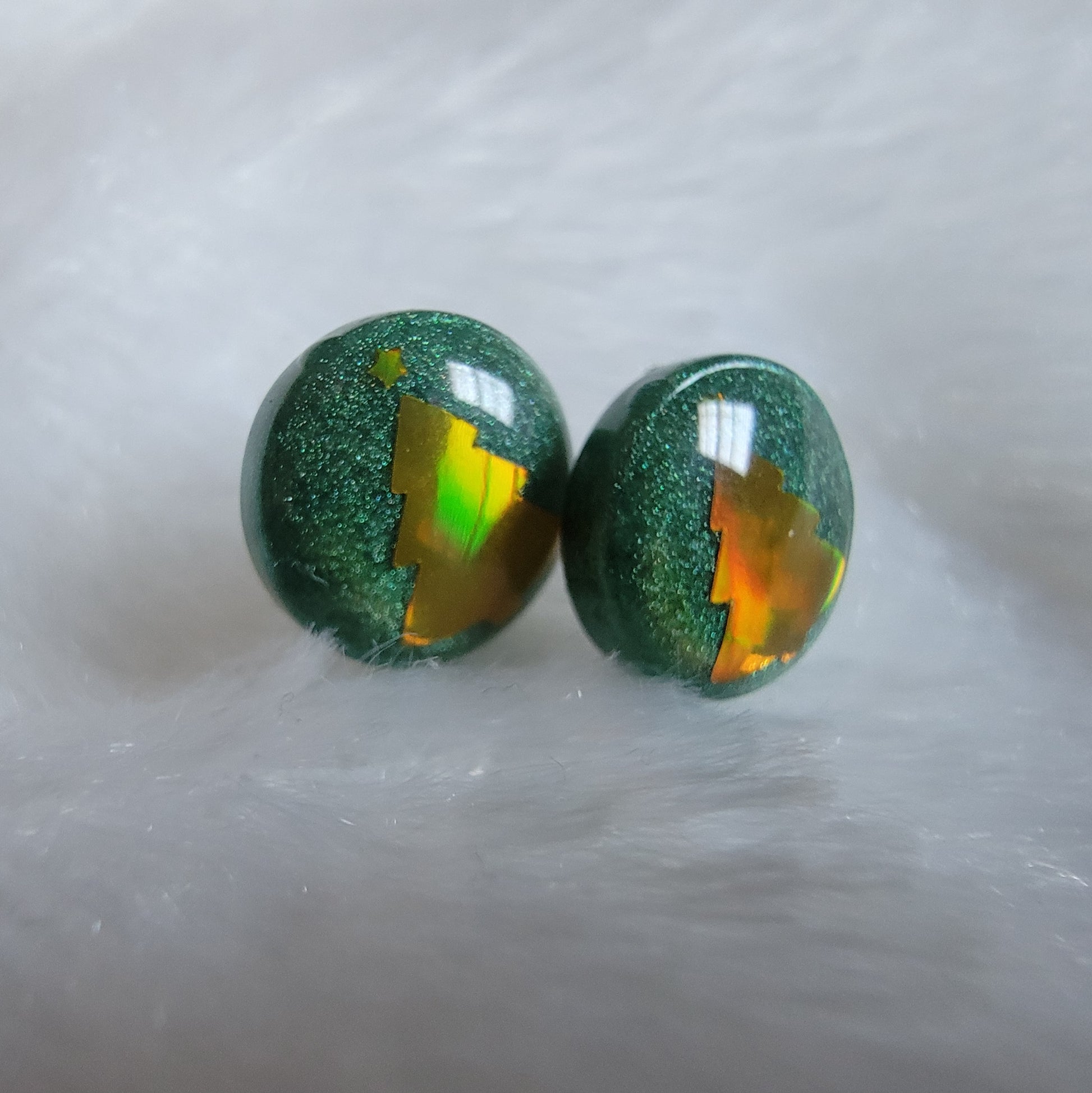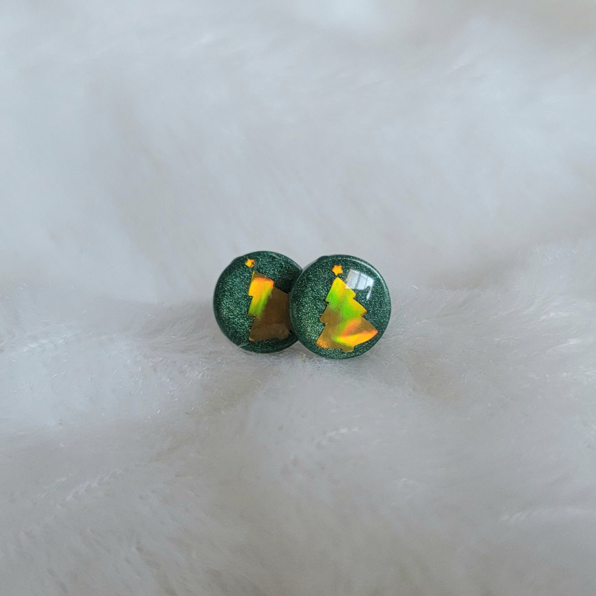 Elevate your holiday aesthetic with these exquisitely hand-crafted epoxy resin post earrings. Each 10mm round base features seasonal shimmering bases decorated with festive holiday or winter designs. Mounted on surgical steel posts with comfortable silicone backs, they offer the perfect balance of beauty and comfort.
