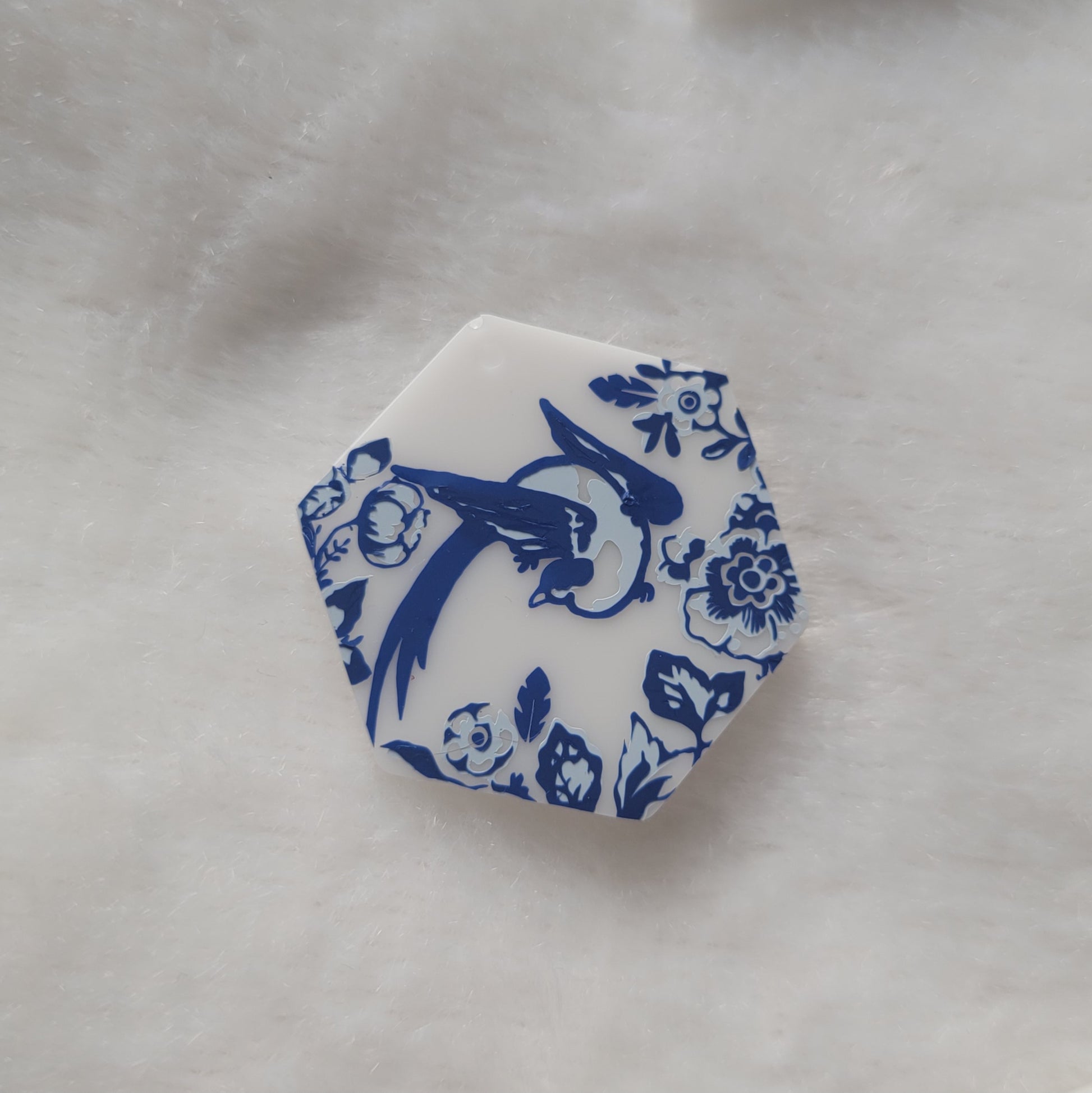 Combine the iconic appearance of delftware ceramic with modern motifs and materials. This modest sized hexagon piece features a classic lovebird and floral design with deep and light blue tones on a white base.