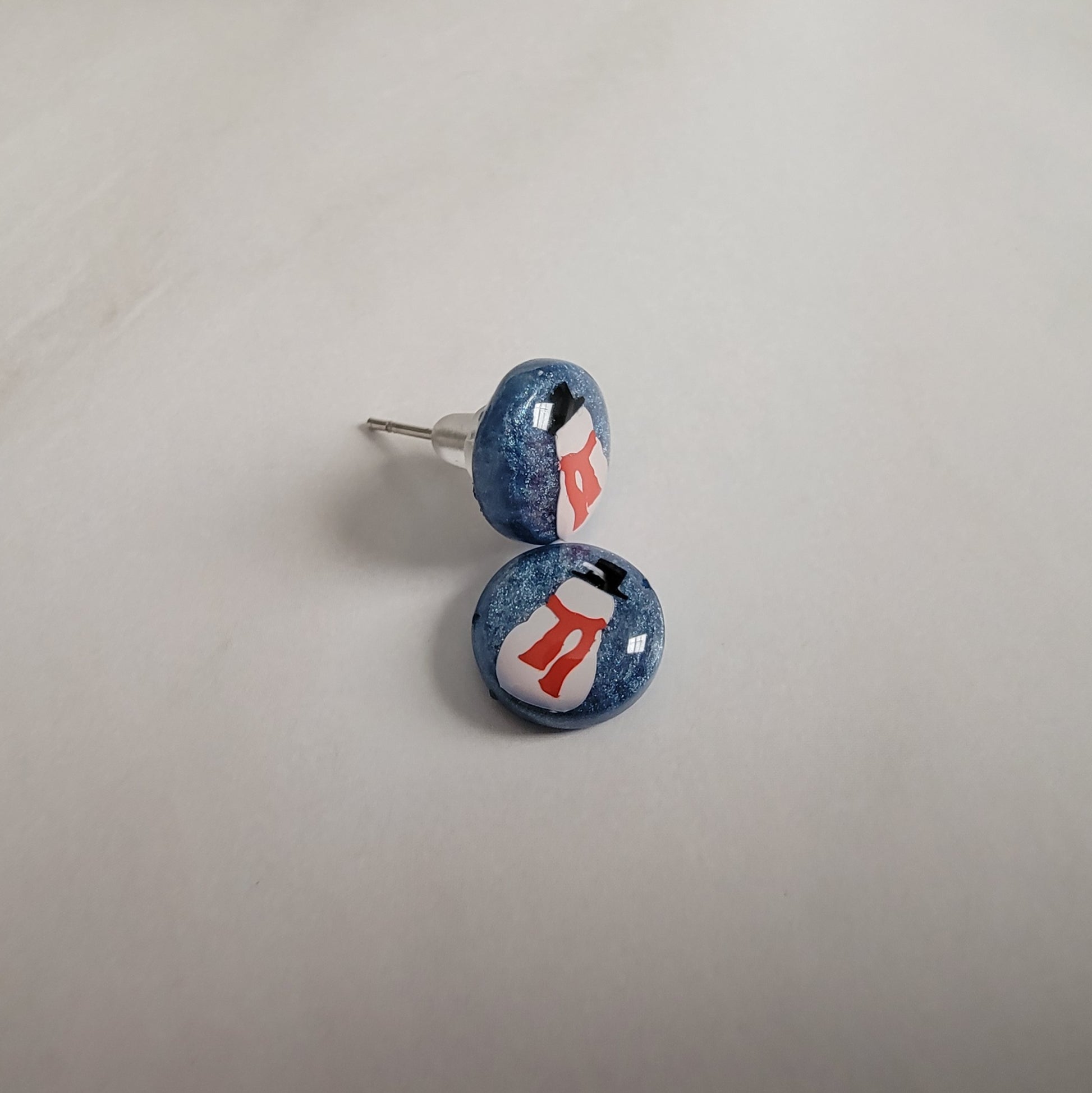 Elevate your holiday aesthetic with these exquisitely hand-crafted epoxy resin post earrings. Each 10mm round base showcases shimmering icy blue pigment, adorned with a little snowman design. Mounted on surgical steel posts with comfortable silicone backs, they offer the perfect balance of beauty and comfort.